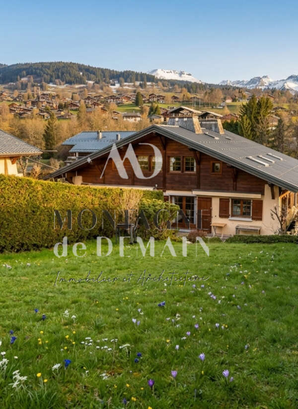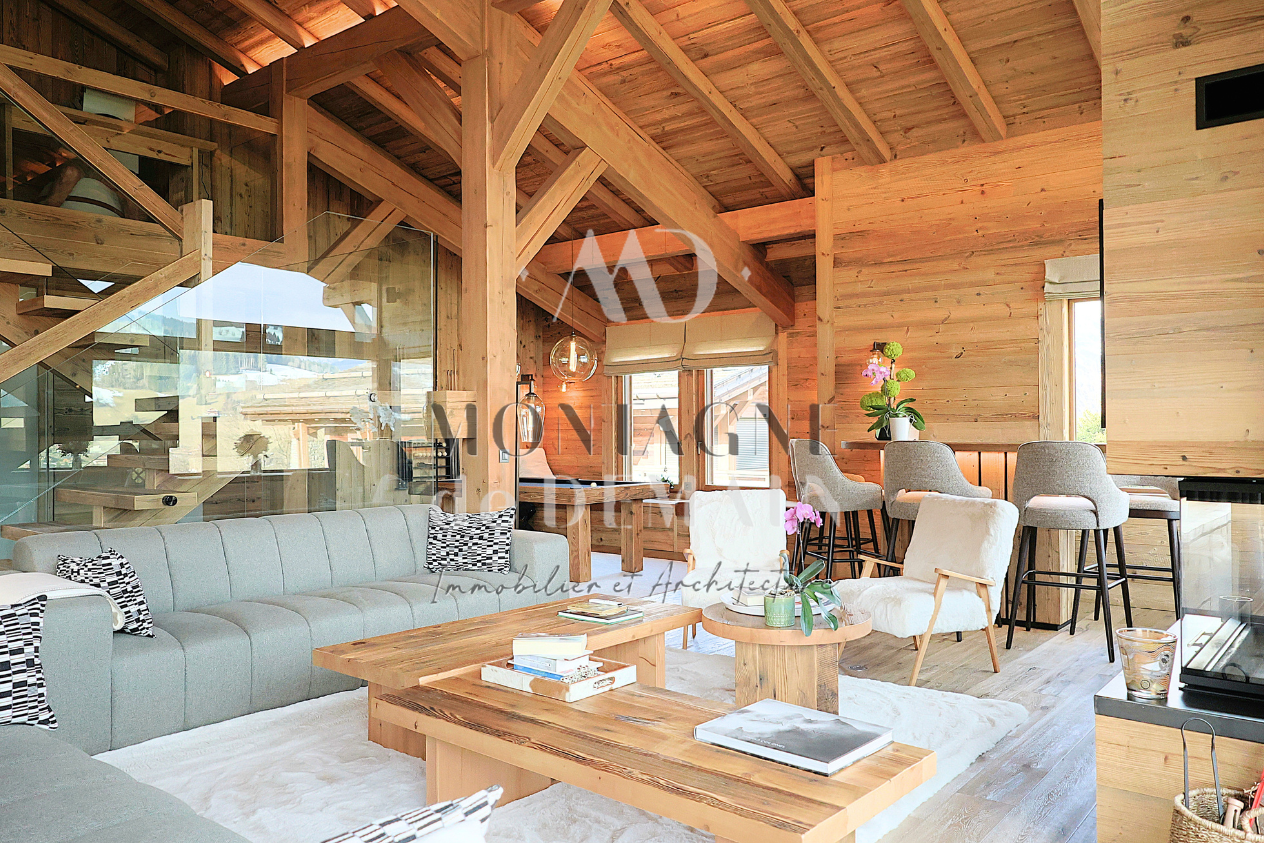 Chalet d’exception aux prestations haut de gamme d’une surface totale d’environ 268m2 sur 3 niveaux en cours de construction, offrant une vue panoramique sur la chaîne du Mont Blanc.